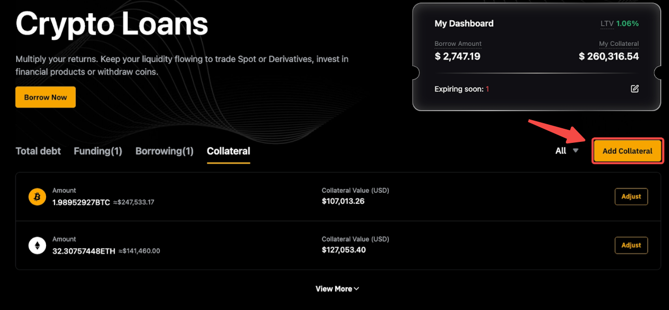 Чтобы проверить свои займы, перейдите на страницу Криптозаймы, где вы увидите общие суммы займов, обеспечения и ордеров.