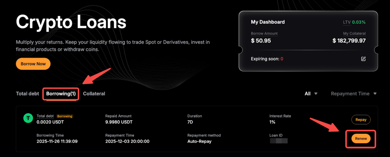 Функция продления криптозайма доступна только для погашенных заказов на сумму более 0 и более чем за 6 часов до срока погашения. Обратите внимание, что каждый криптозайм может быть продлен до 5 раз.