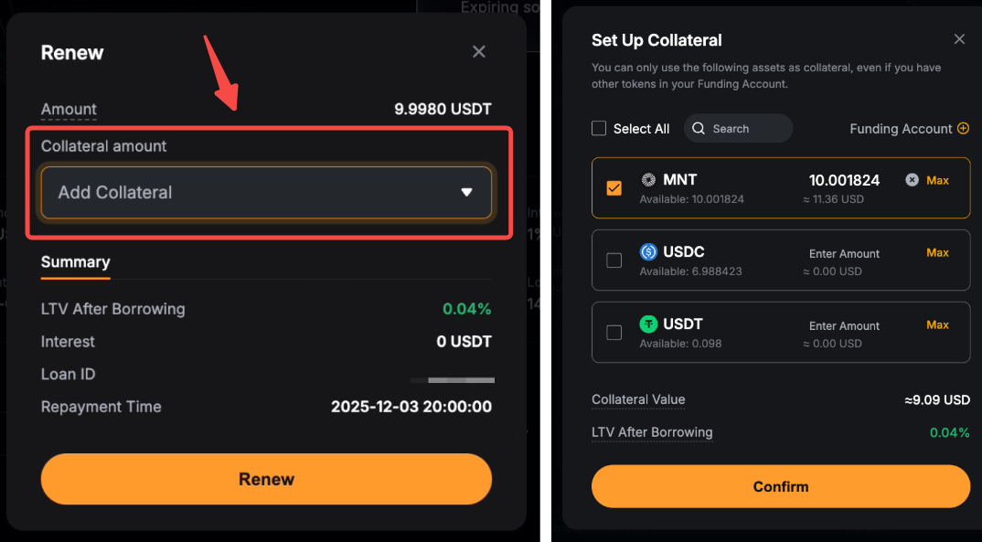 - Сумма обеспечения: выберите поддерживаемый актив обеспечения на аккаунте финансирования.