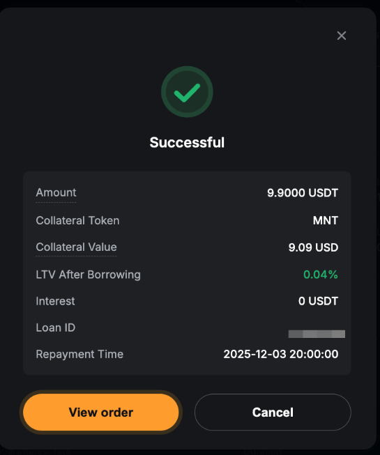 - Сумма займа: Нажмите Макс, чтобы получить максимальную сумму займа на основе стоимости обеспечения и лимита займа актива.