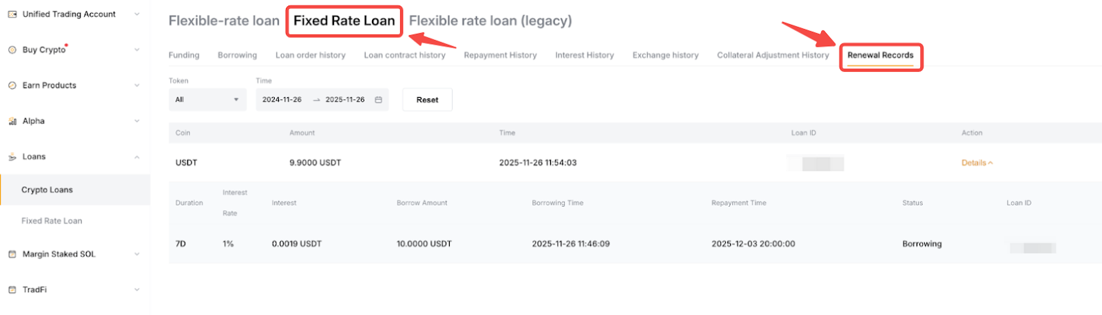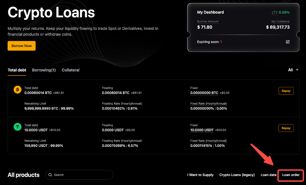 Чтобы просмотреть полный список всех ваших ордеров, нажмите на Ордер займа на панели Обзора. Вы можете просмотреть все ордера криптозаймов, переключаясь между вкладками продуктов в верхней части экрана, включая Обязательства - Гибкие, Обязательства - Фиксированные. Здесь вы найдете подробную информацию о вашем займе, платежах, процентах, обеспечении и многом другом. Можно также отфильтровать результаты по активу или времени.