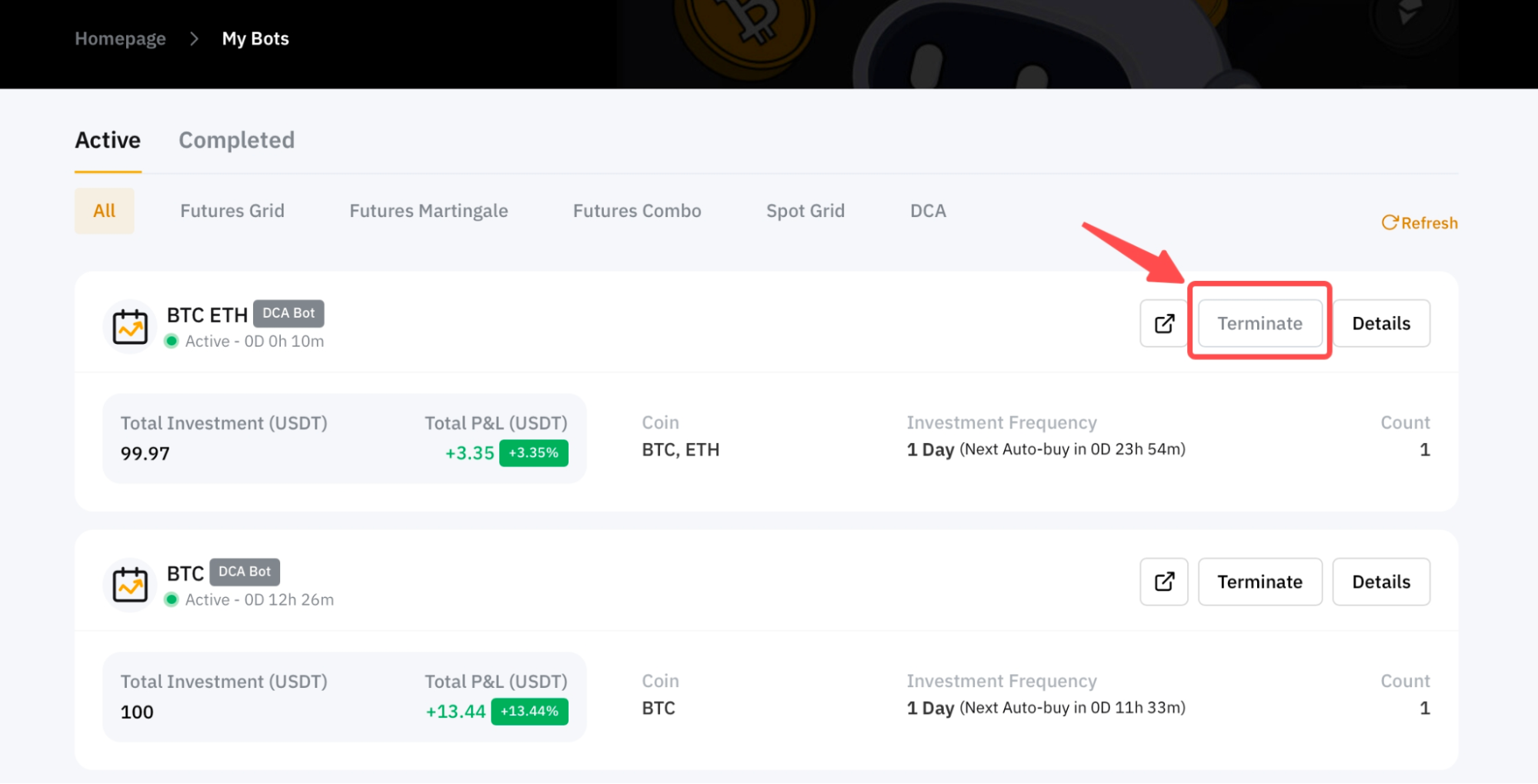 Шаг 2: нажмите Удалить в правом верхнем углу DCA-бота, чтобы отключить его.