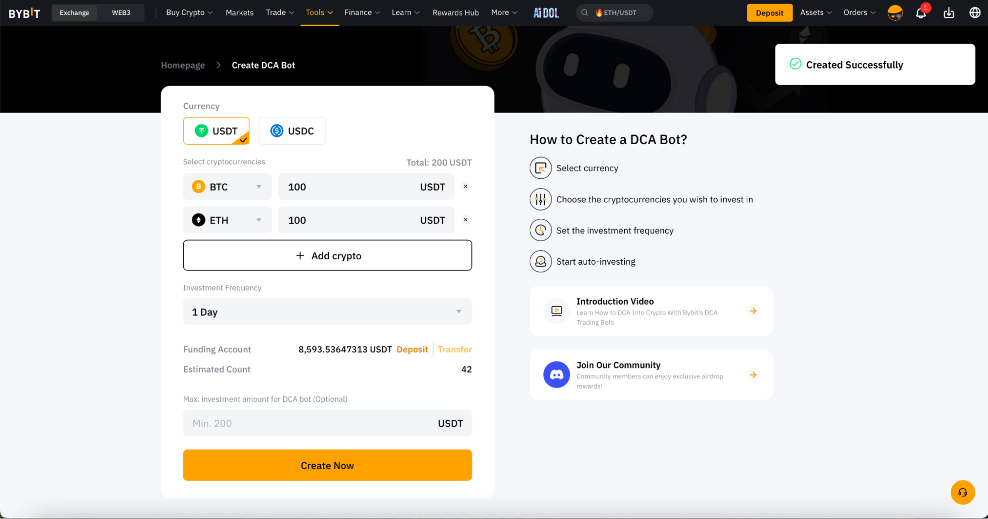 Обратите внимание, что первые DCA-инвестиции начинаются сразу после успешного создания DCA-бота.