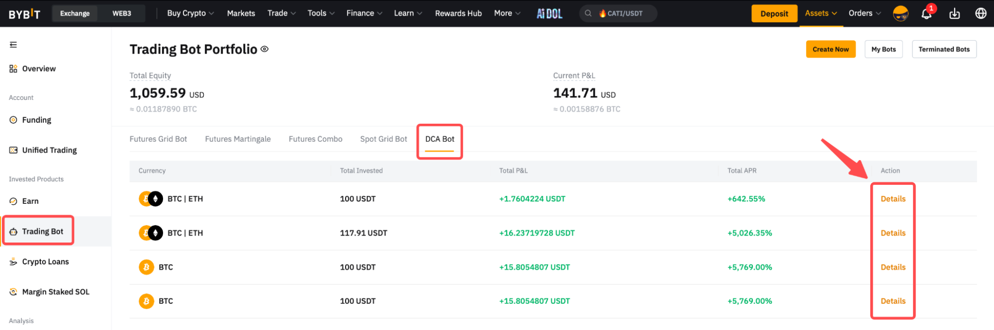 Шаг 1: нажмите Просмотреть моих ботов в верхнем левом углу страницы торгового бота Bybit. Затем нажмите Подробная информация в правом верхнем углу DCA-бота, параметры которого вы хотите изменить.
