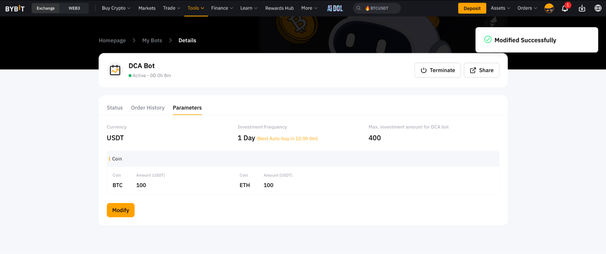 — Новая DCA-стратегия вступит в силу сразу после изменения и успешного сохранения параметров.