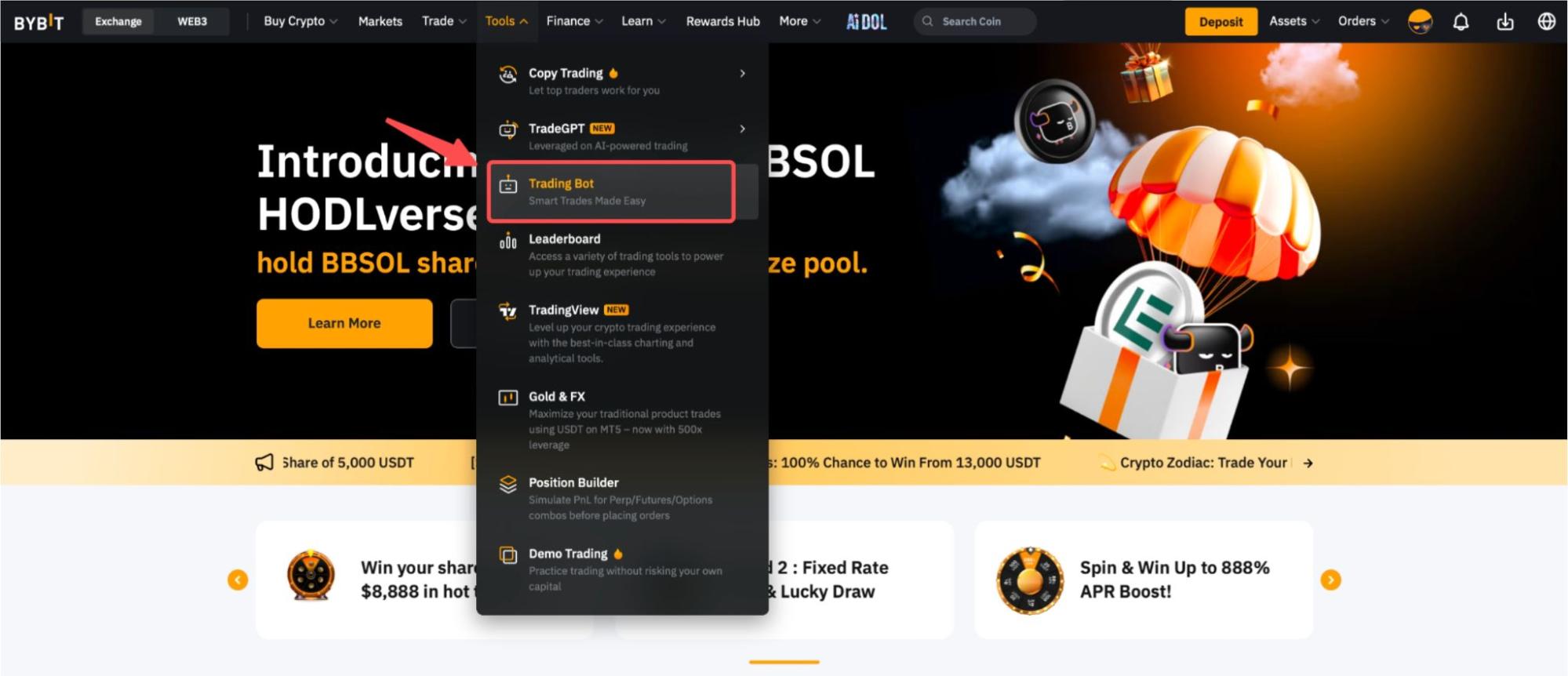 Шаг 1: нажмите Инструменты → Торговый бот на панели навигации, чтобы перейти на страницу торгового бота Bybit.