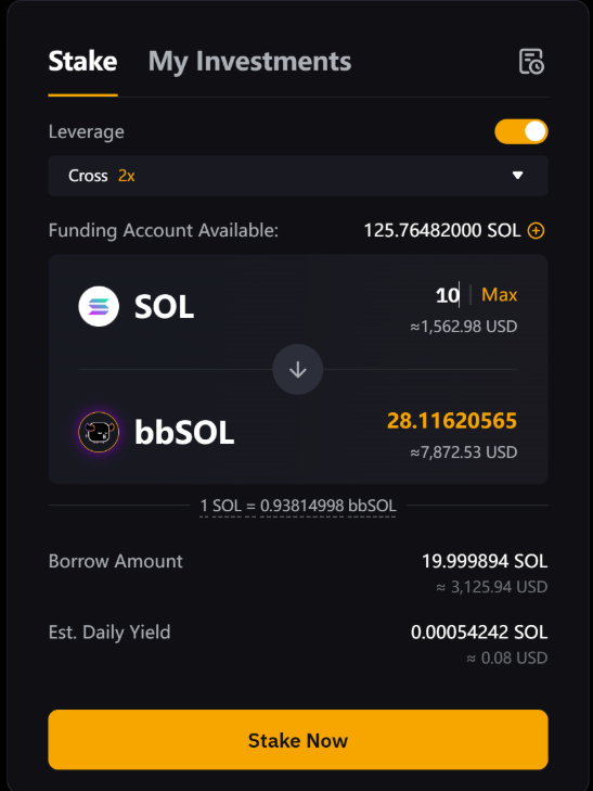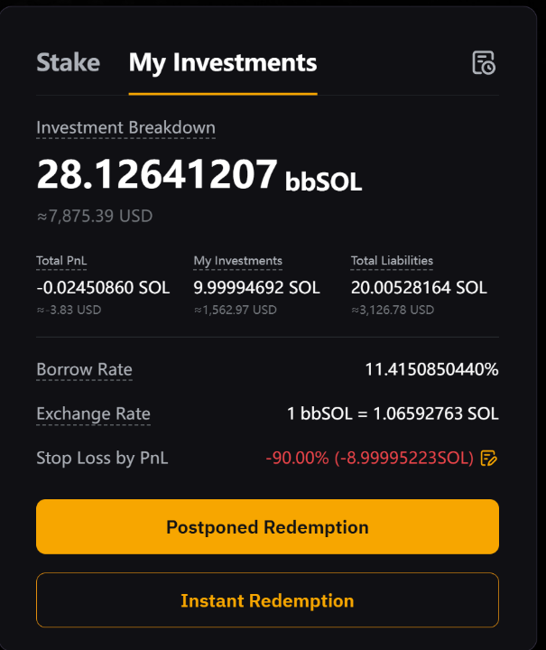 Ожидаемая сумма bbSOL к получению. Рассчитывается на основе вашего кредитного плеча, SOL в стейкинге и обменного курса SOL и bbSOL в реальном времени.