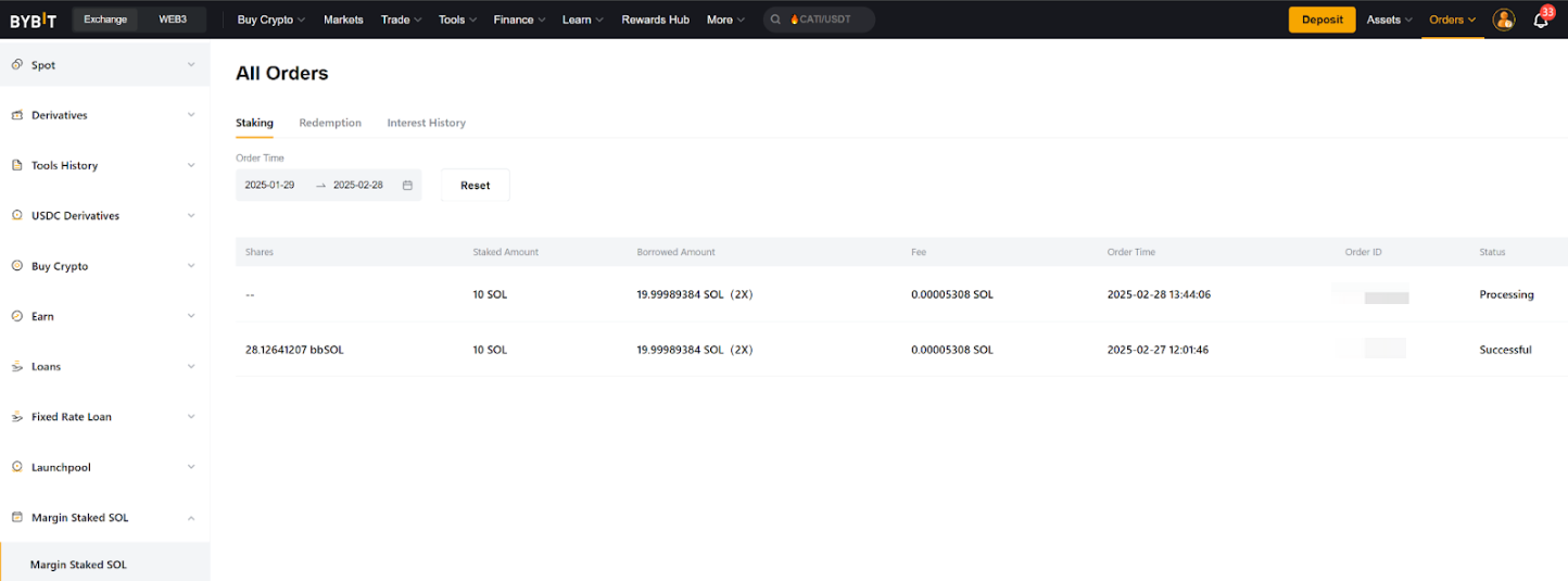 Шаг 2. На странице Ордера маржинального стейкинга SOL приведена подробная информация в разделах Стейкинг, Вывод и История процентов.