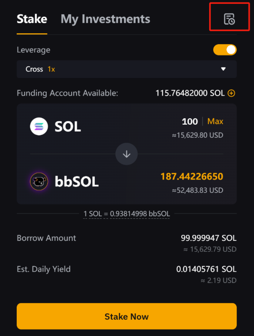 Шаг 1. Чтобы посмотреть ордера, нажмите на значок истории в правом верхнем углу панели Стейкинг или Мои инвестиции на главной странице маржинального стейкинга SOL.