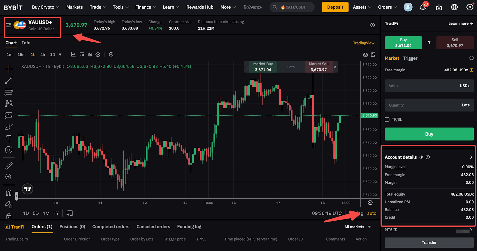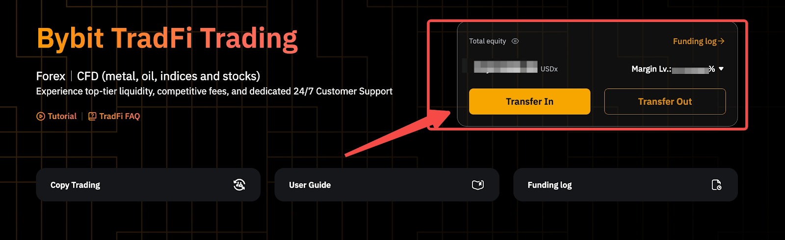 Шаг 2. На странице Bybit TradFi Trading нажмите кнопку Перевести на счет, чтобы перевести средства на ваш счет TradFi.