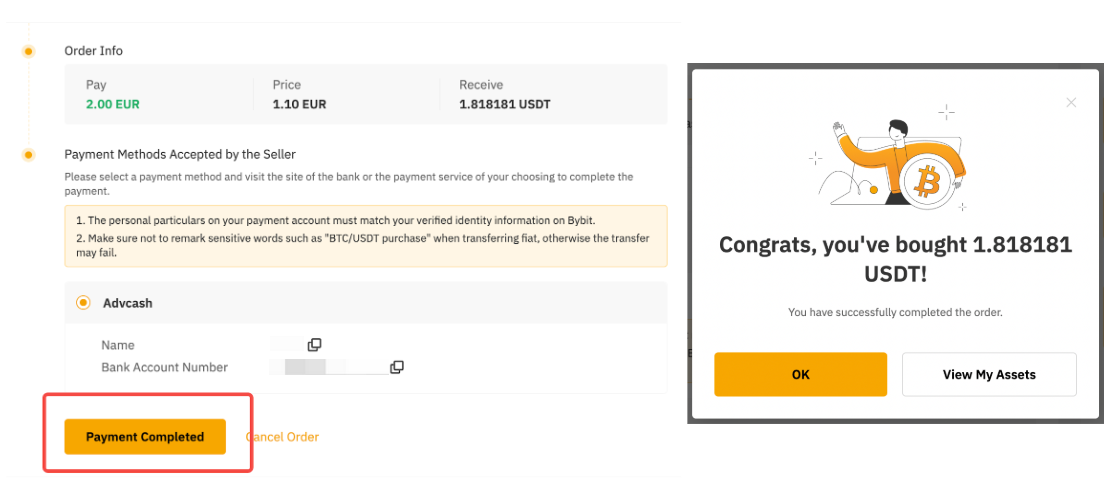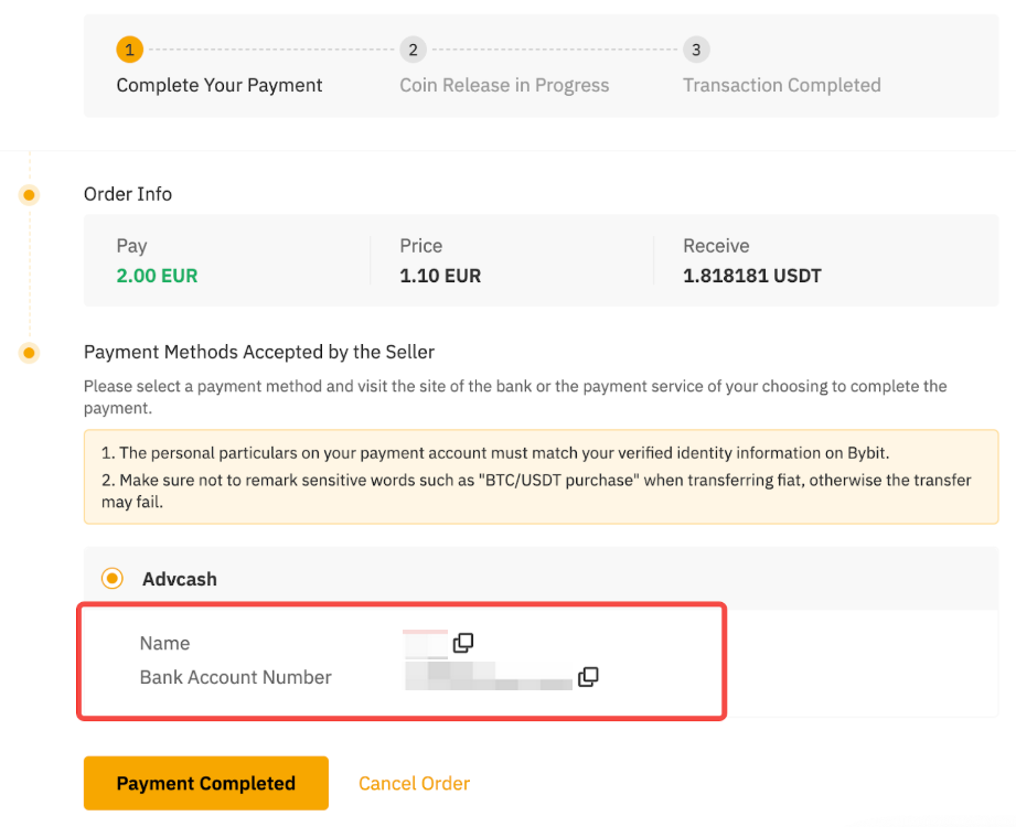 — Имя на вашем банковском счете должно совпадать с вашим зарегистрированным именем в Bybit. В противном случае рекламодатель может отменить ордер и оформить возврат средств.