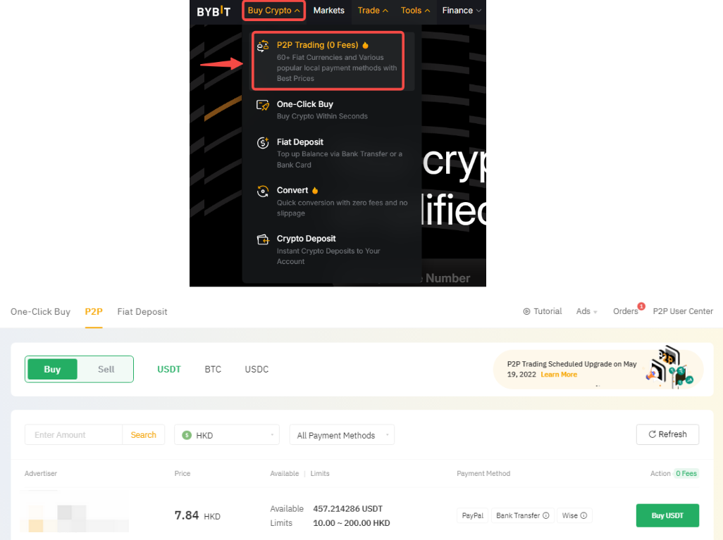 Шаг 1. Нажмите Купить криптовалюту → P2P Торговля в верхнем левом углу панели навигации, чтобы перейти на страницу P2P Trading. Если вы хотите купить USDT, выберите предпочитаемое объявление и нажмите Купить USDT.