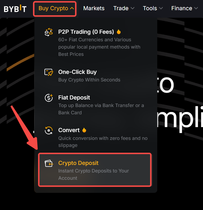 Также можно навести курсор на Активы в правом верхнем углу главной страницы Bybit. Затем нажмите Внести, чтобы перейти на страницу депозита.