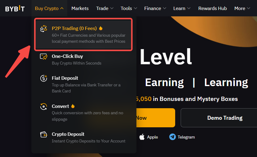 Шаг 1: Нажмите Купить криптовалюту → P2P Торговля  в верхней левой части панели навигации, чтобы перейти на торговую страницу P2P.