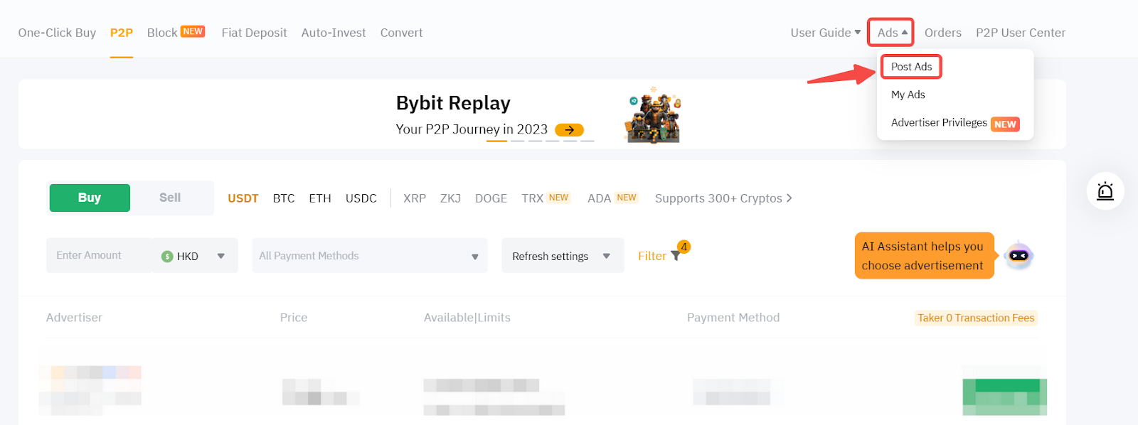 Шаг 2: В правом верхнем углу торговой страницы P2P нажмите Объявления → Разместить объявления.