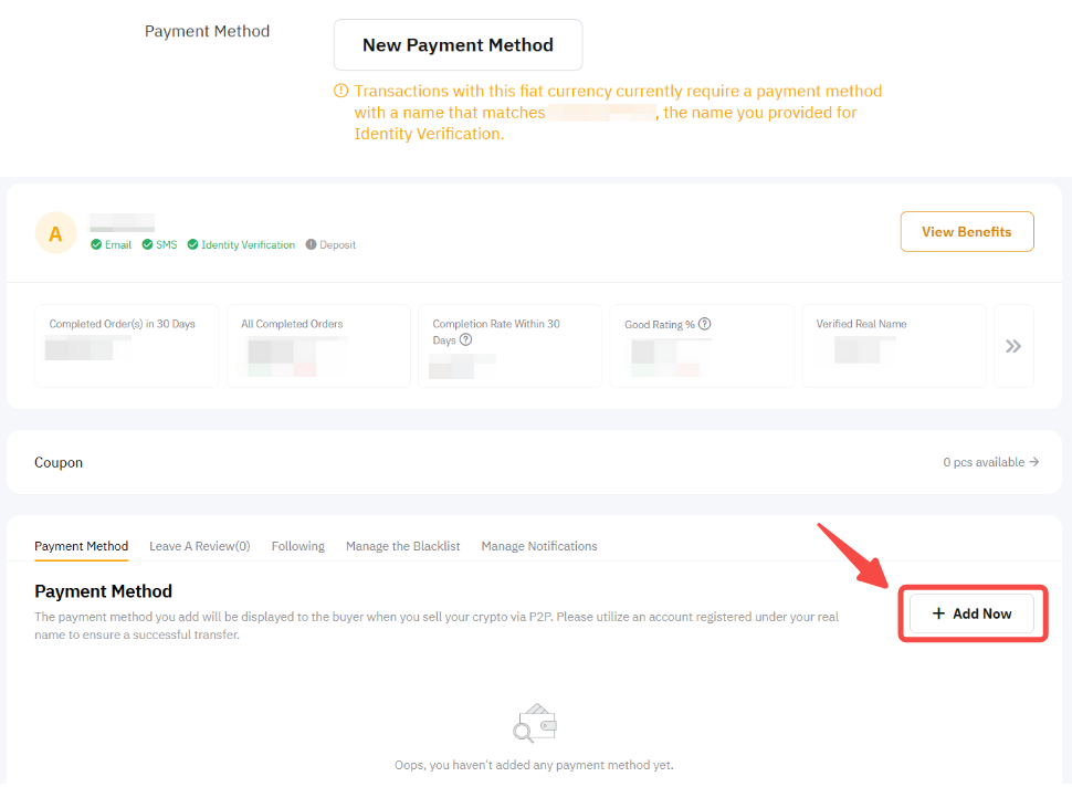 Нажмите на Способы оплаты, и вы будете перенаправлены в P2P центр пользователя для добавления способа оплаты.