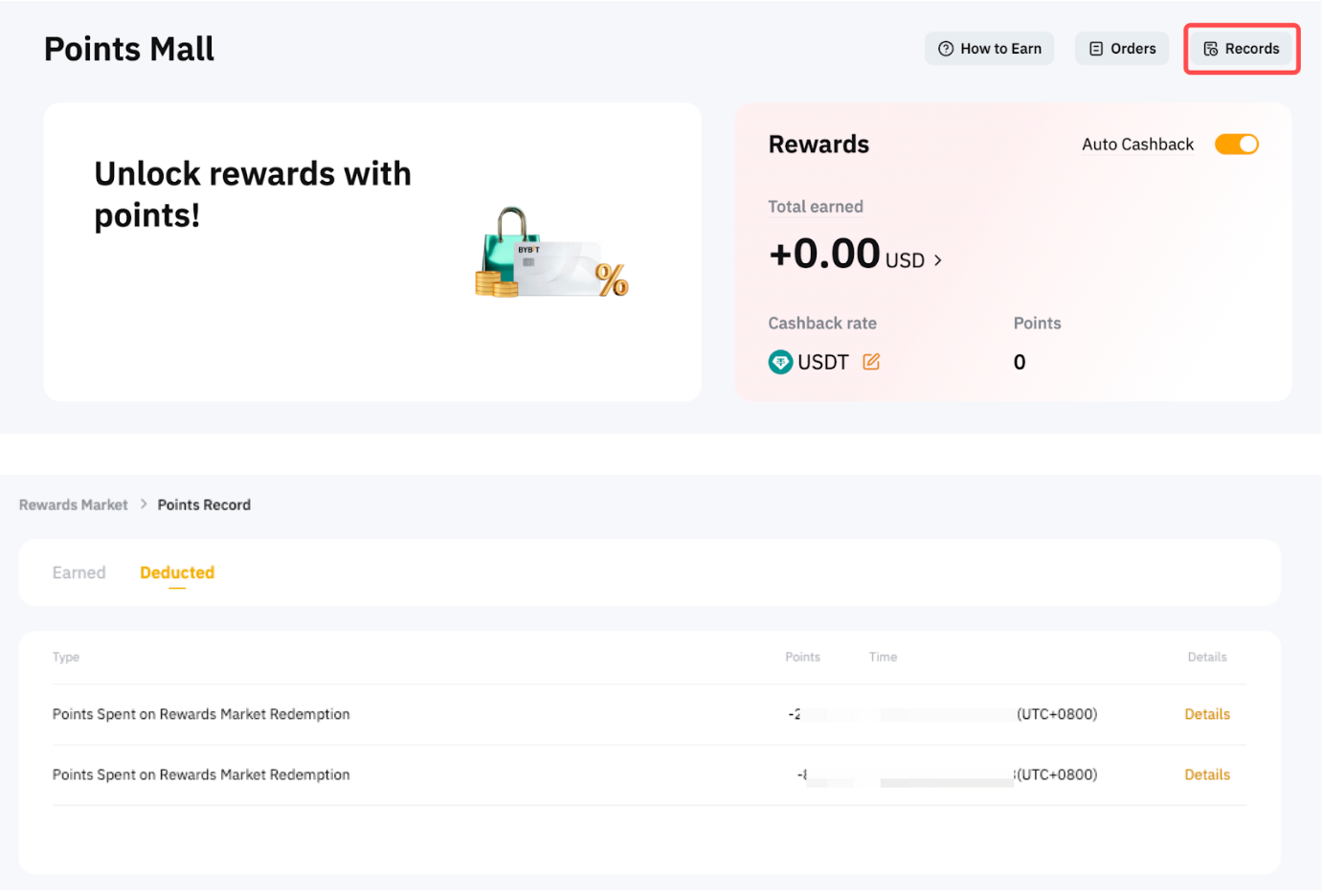 Нажмите на иконку «Записи» на странице «Центра Баллов». Вы можете просмотреть полученные и вычтенные баллы, переключаясь между вкладками на странице Points records.