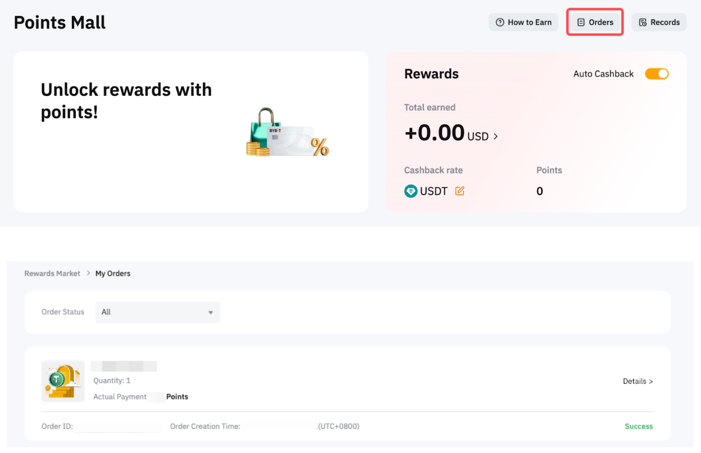 Данные о статусе получения можно найти на странице Мои ордера. Нажмите Подробнее, чтобы получить доступ ко всей информации, связанной с получением, включая ID ордера, время создания, время исполнения, тип монеты, валюту, сумму бонуса и сумму оплаты баллами.