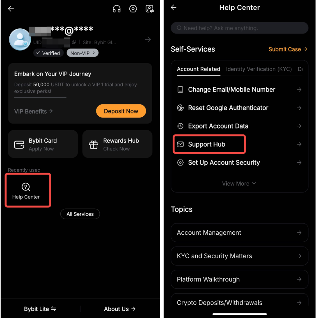 Шаг 1: Перейдите в Справочный центр Bybit и нажмите «Центр поддержки».
