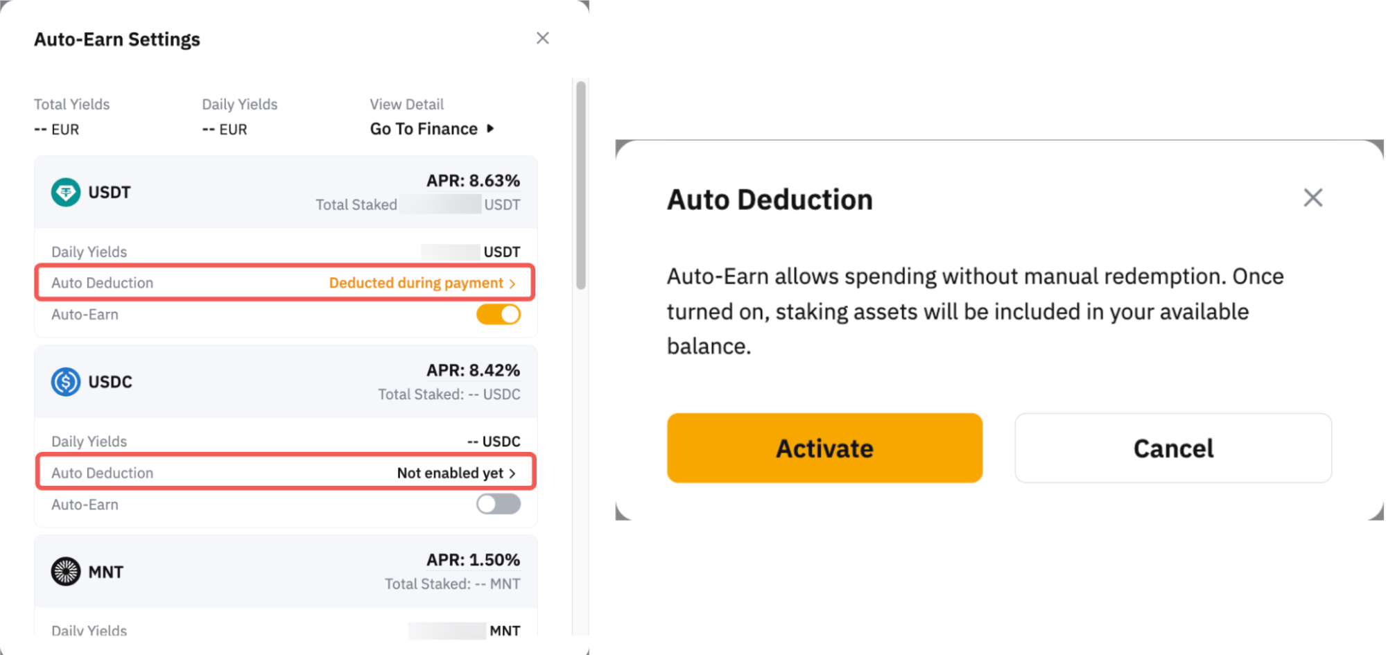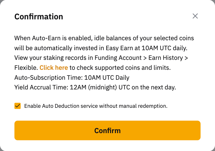 При включении Auto-Earn остаток вашего платежного криптоактива, доступный к переводу, (показанный для каждой валюты) на вашем аккаунте финансирования будет автоматически подписан на планы гибкого срока на следующий день.