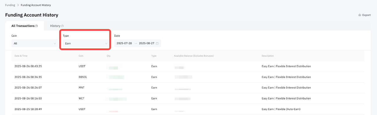Вы можете просмотреть свои успешные транзакции истории аккаунта финансирования в разделе Earn.