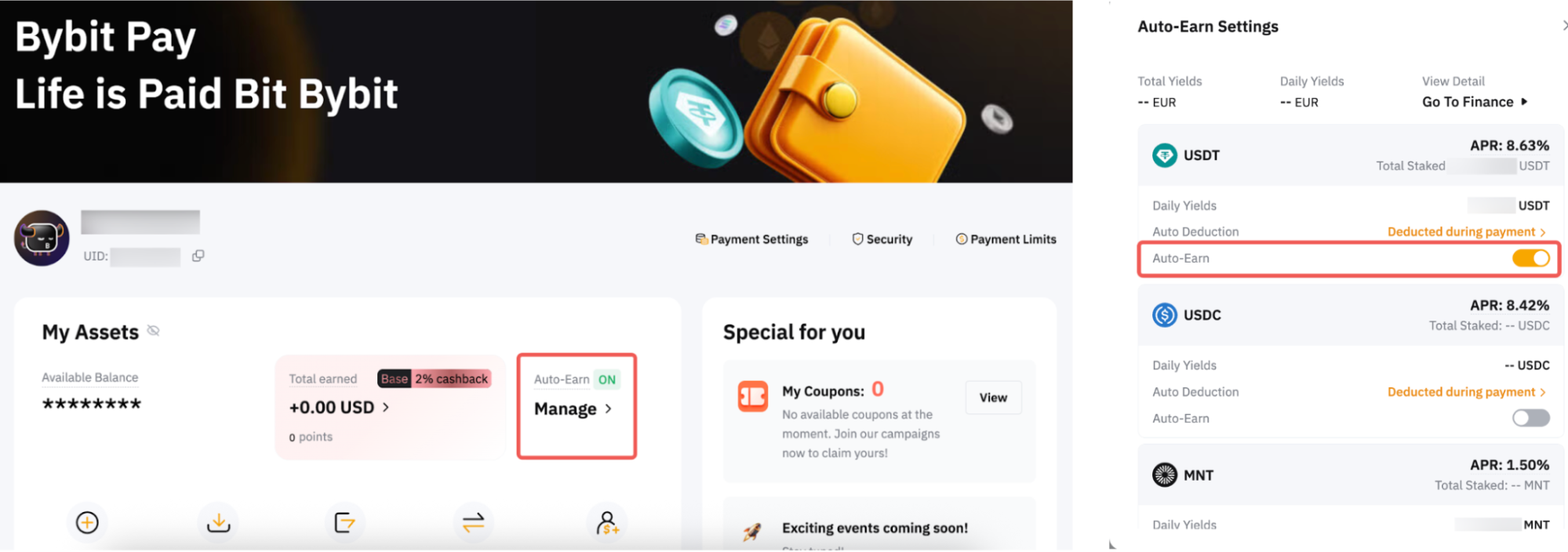 Шаг 2. На странице активов Bybit Pay найдите кнопку переключателя Auto-Earn и включите ее.