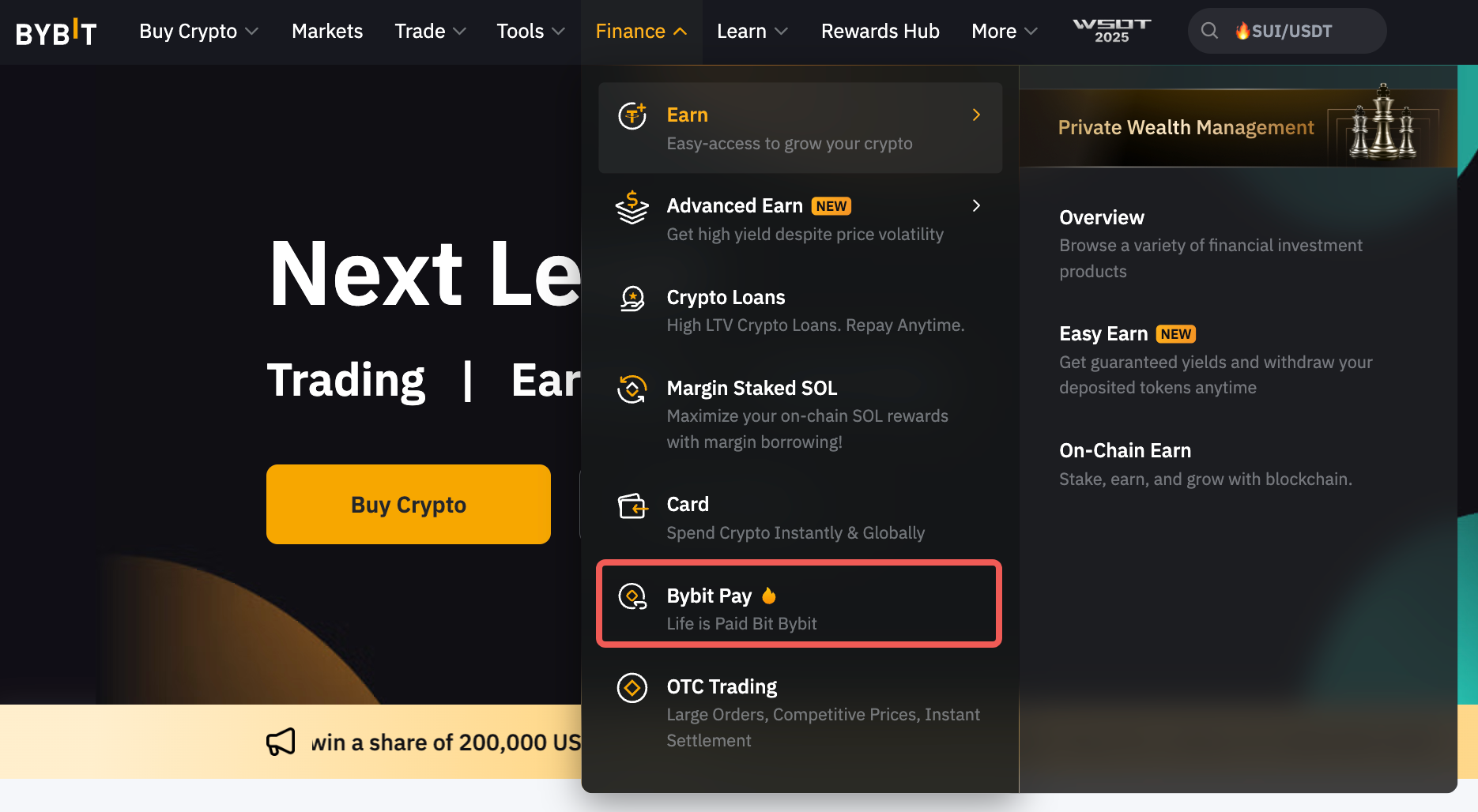 Шаг 1. Наведите на Банкинг в верхнем левом углу панели навигации на странице Bybit, затем выберите Bybit Pay, чтобы перейти на страницу Bybit Pay.