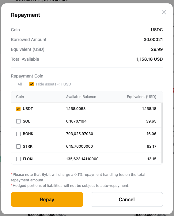 Step 2: The system will first use your available borrowed coin for repayment. Any remaining amount will be covered by converting your collateral into the borrowed coin.