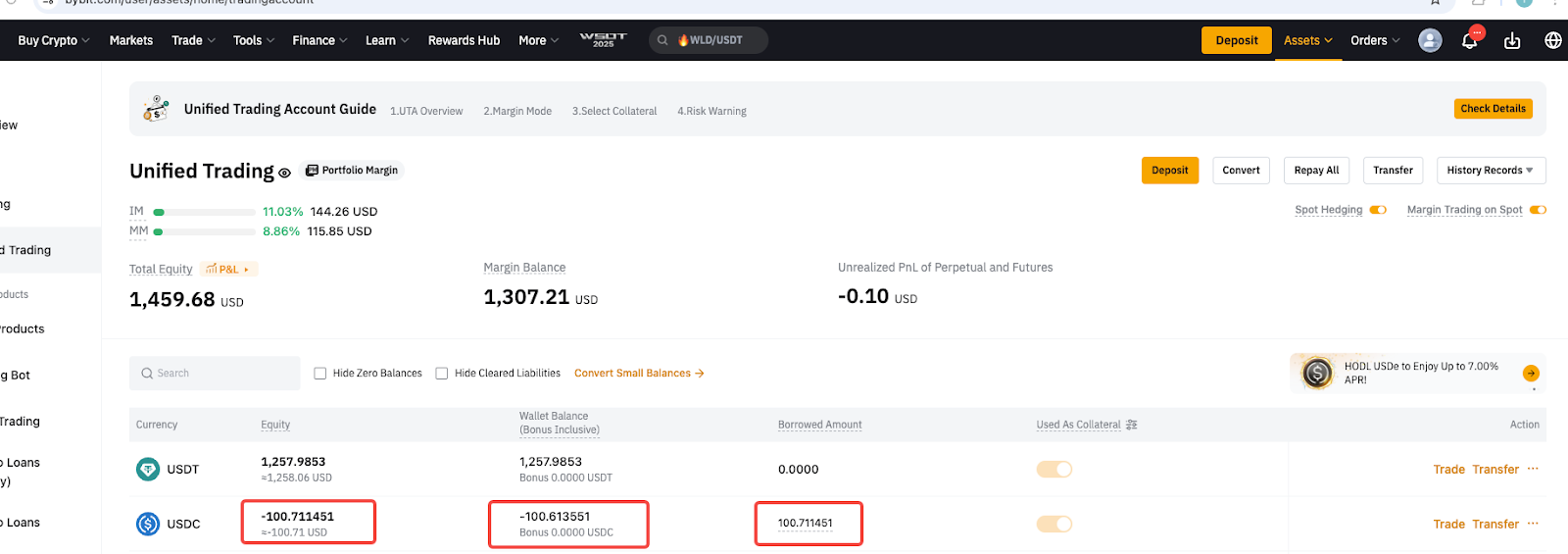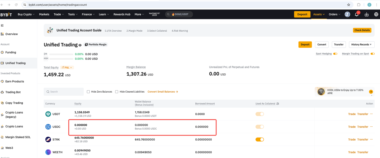 After transferring in USDC, only Derivatives liabilities are repaid automatically, while Spot liabilities remain unpaid.
