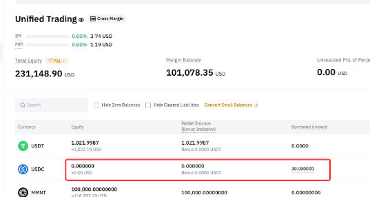 • USDC wallet balance = -30