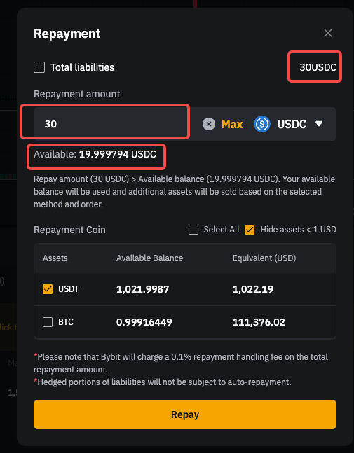 If you have insufficient borrowed coins, you can make a full repayment with other collateral assets. The system will convert collateral to repay the borrowed coins, and a 0.1% handling fee will apply.