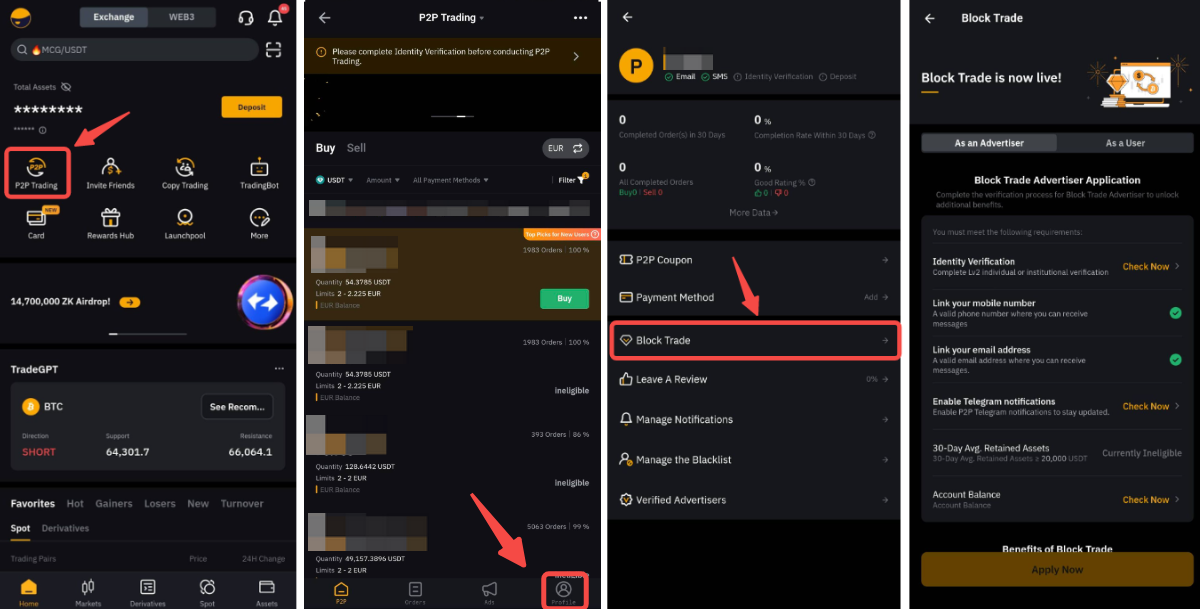 Если вы находитесь в приложении, перейдите на страницу P2P и нажмите на иконку профиля, чтобы открыть центр пользователя P2P. Нажмите Ещё, чтобы отобразить информацию о P2P-трейдинге.