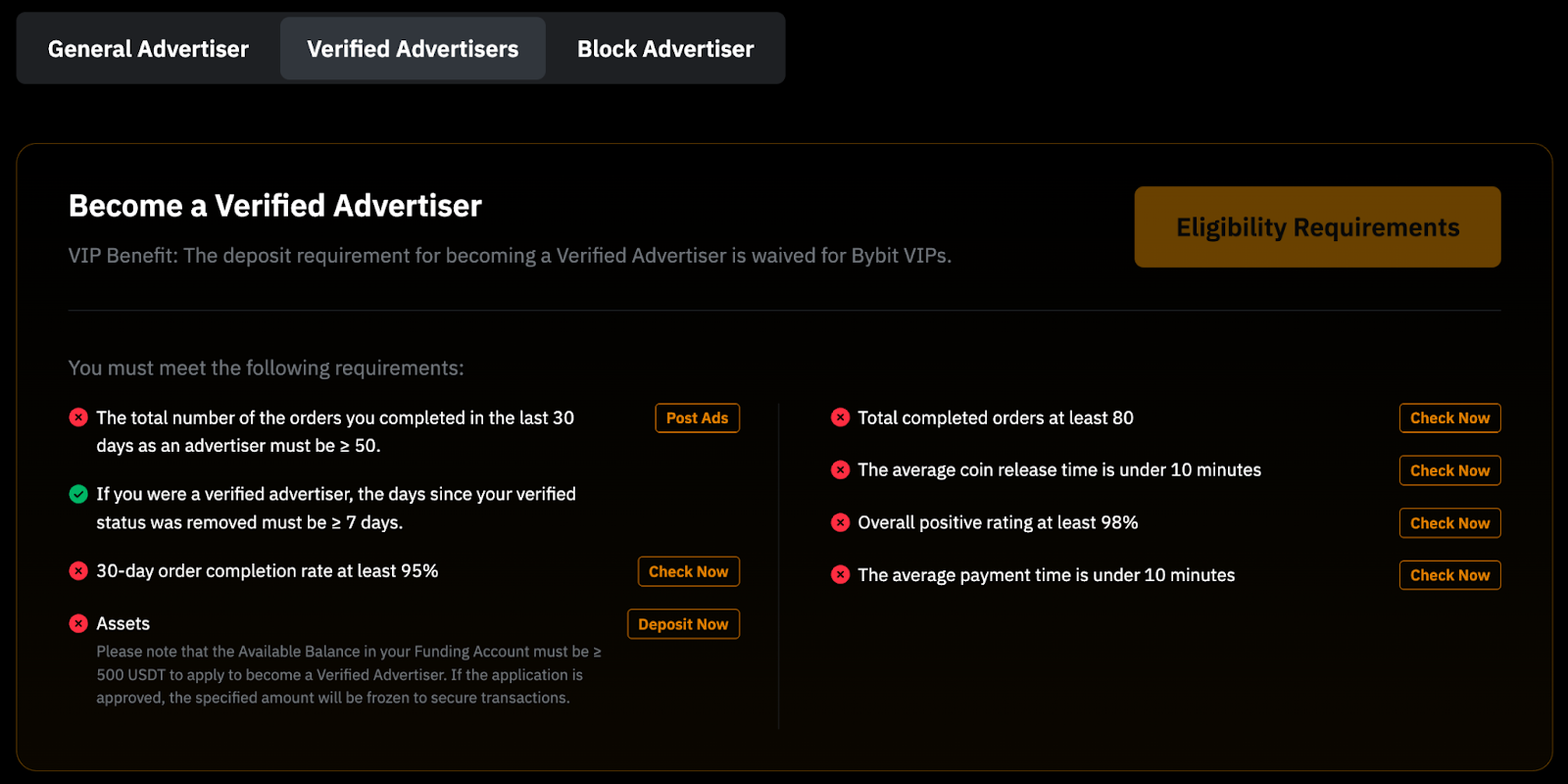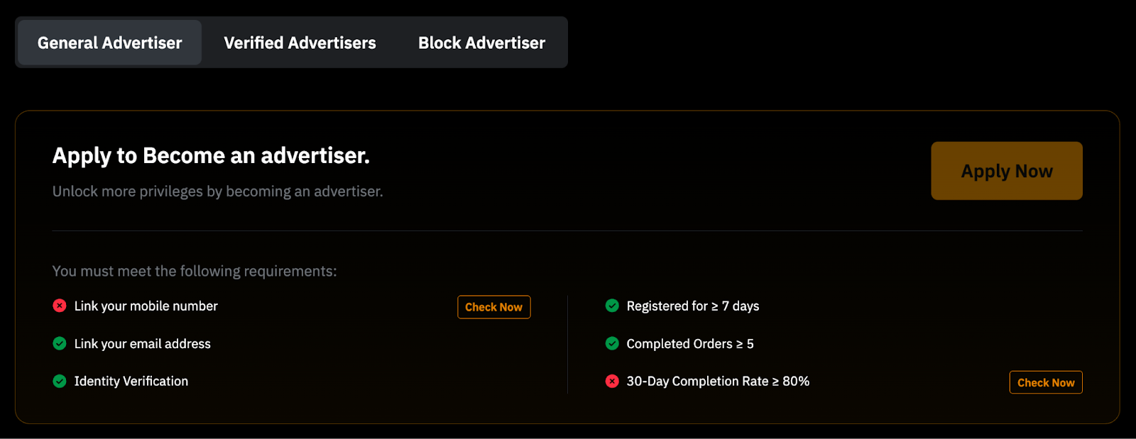 Чтобы стать проверенным мейкером или блок-мейкером, необходимо ознакомиться с соответствующими требованиями и подать заявку на получение статуса, перейдя на страницу Программы для мерчантов P2P.