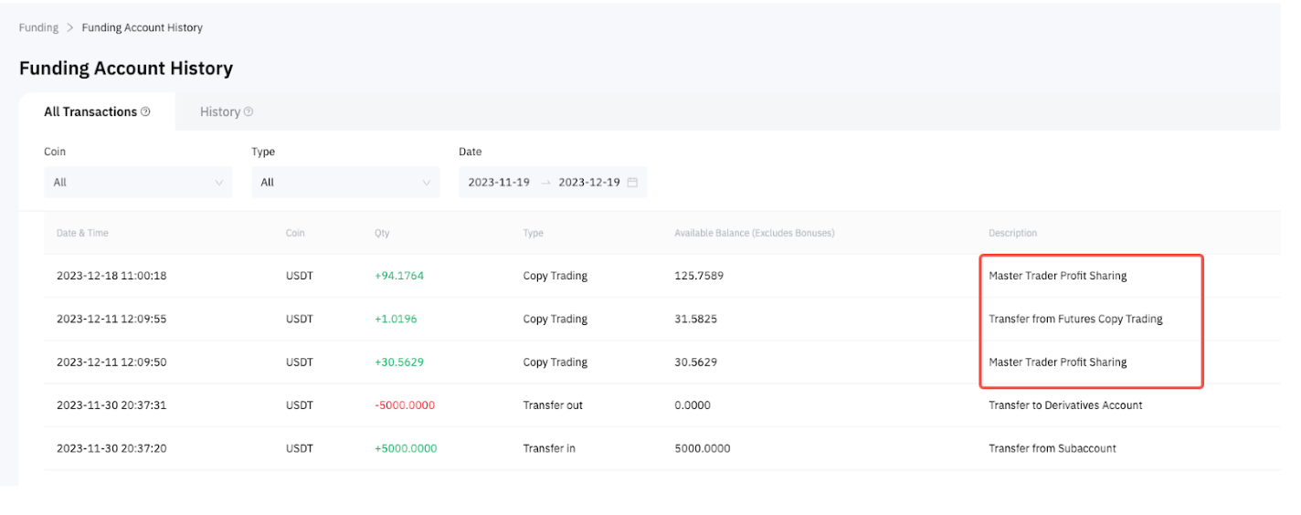 Можно посмотреть запись о распределении доли прибыли в истории аккаунта финансирования.